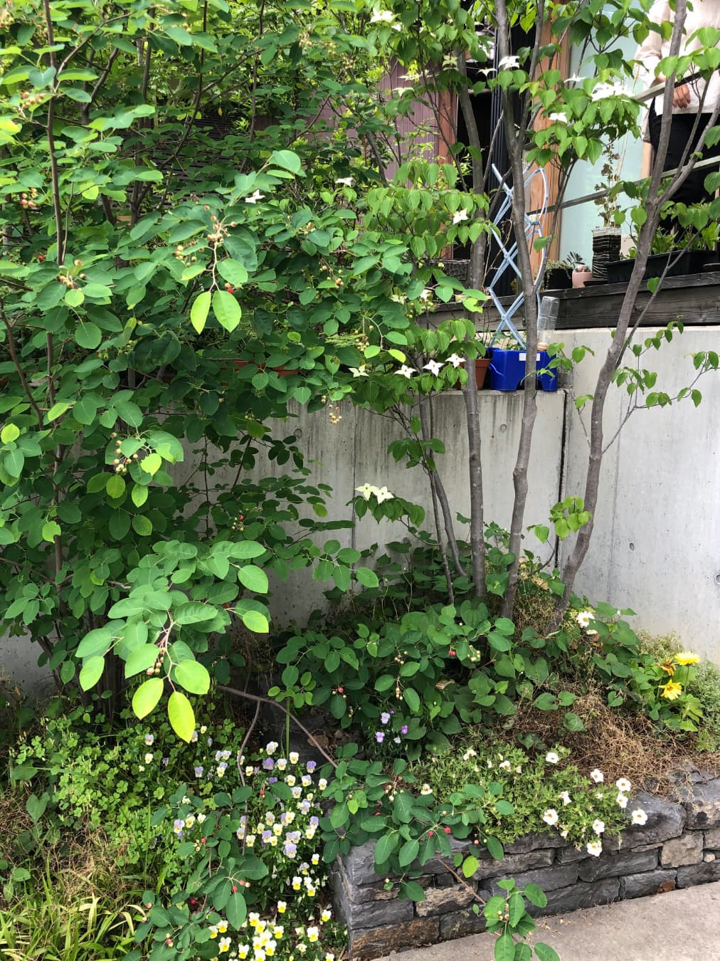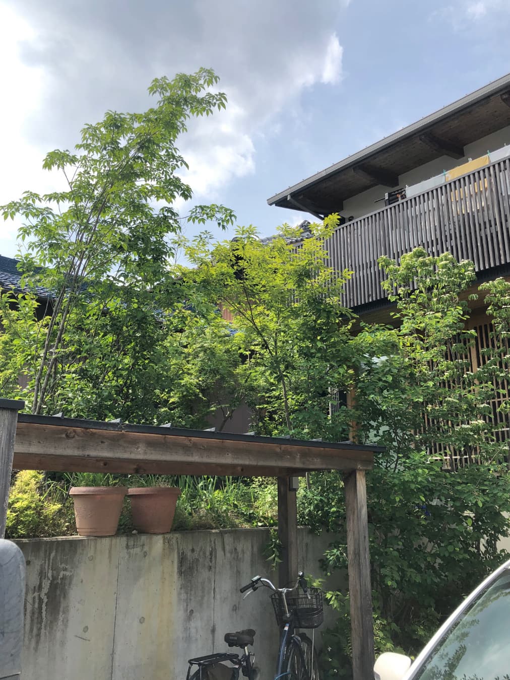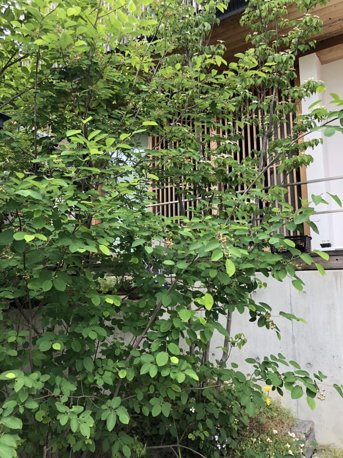 駐車場から視線避けのためにヤマボウシ。葉の上に花が咲くので上から見るのが良い木です